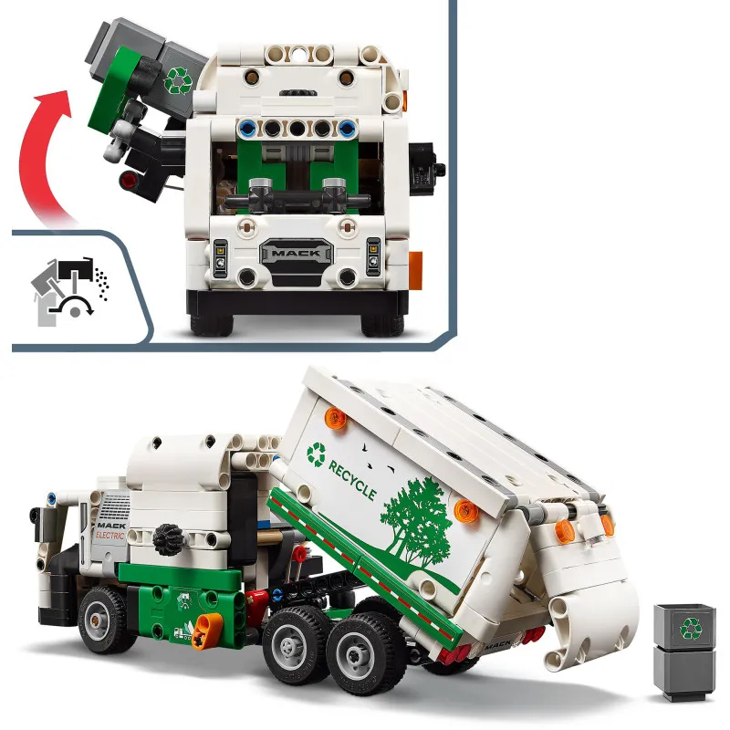 LEGO® Technic Mack® LR Электрический мусоровоз (42167) вдохновляет мальчиков и девочек старше 8 лет задуматься о значимости зеленой энергии и поддержании чистоты города. Игрушка вдохновлена новейшей технологией и функциями электрического мусоровоза Mack.