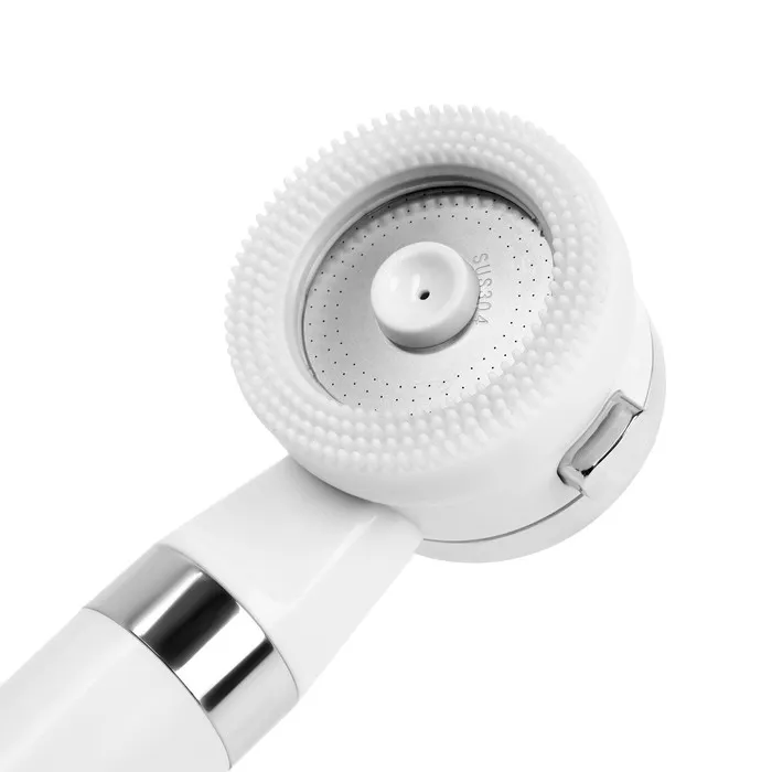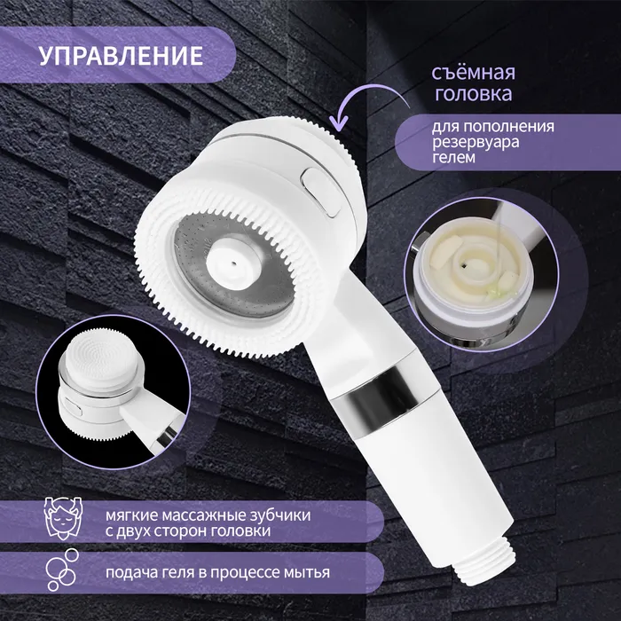 Особенностью данной модели являются мягкие массажные зубчики, которые помогают эффективно очищать поверхность кожи. Также, в лейке есть встроенный отсек для геля, позволяющий удобно наносить средства во время водных процедур.