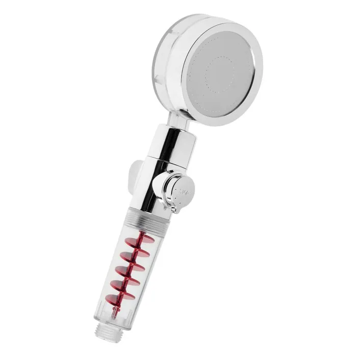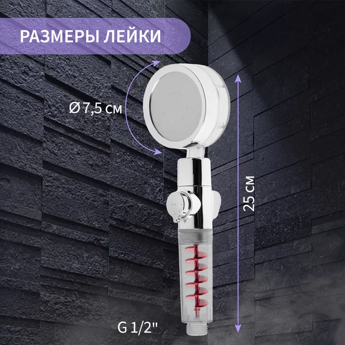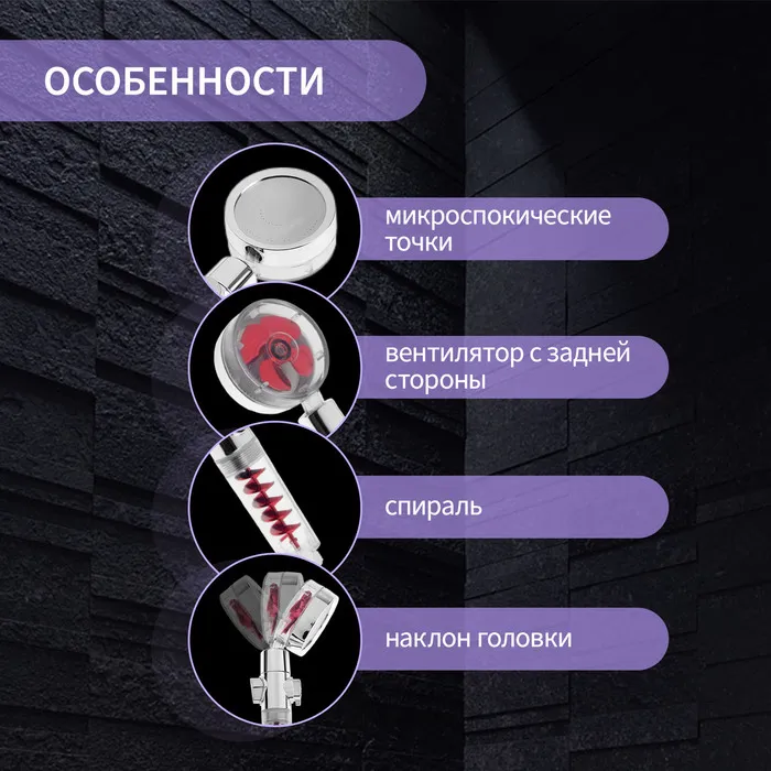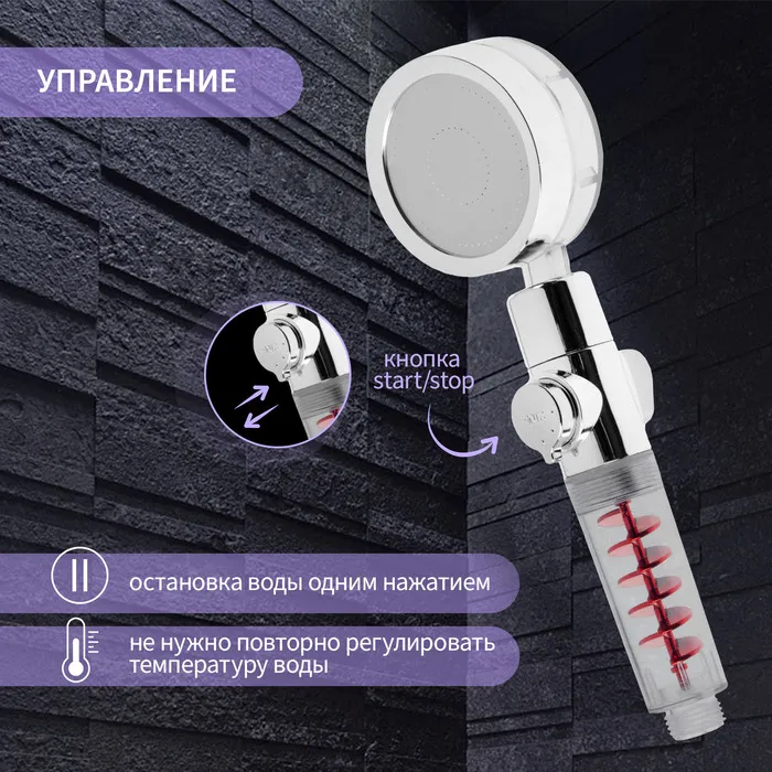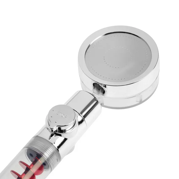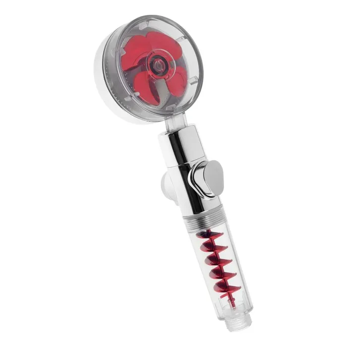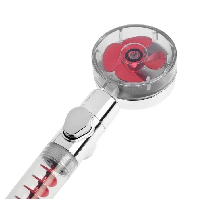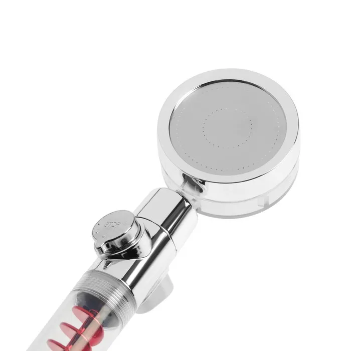 У данной модели есть вентилятор в головке и спираль внутри ручки, через которые проходит поток воды, а также кнопка «стоп».
