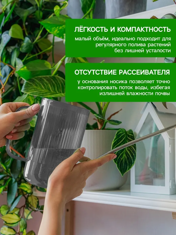 - Лёгкость и компактность — малый объём, идеально подходит для регулярного полива растений без лишней усталости.