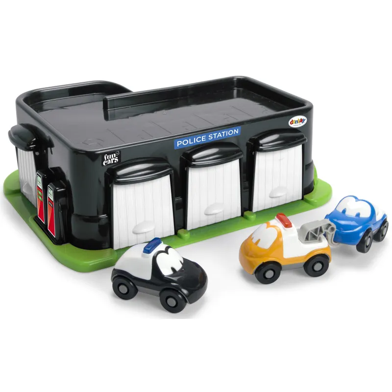 Парковка полицейского участка предлагает массу развлечений, когда три машинки заезжают и выезжают через поднимающиеся двери парковки или едут на крышу по рампе.