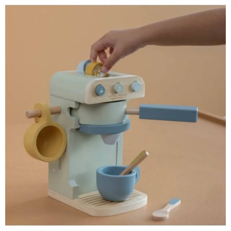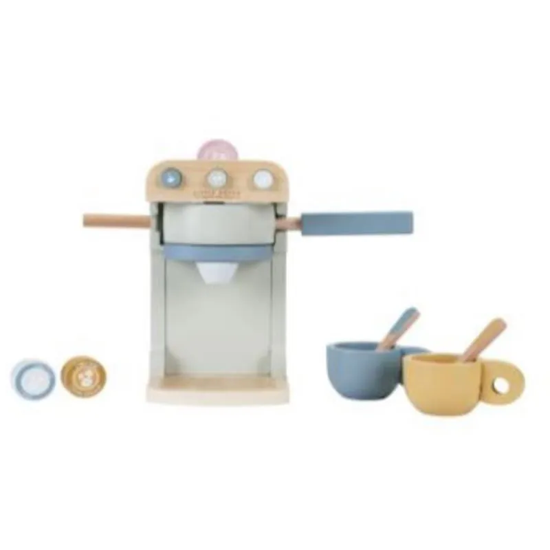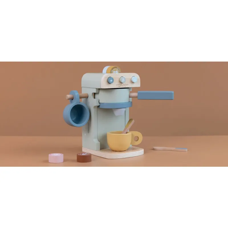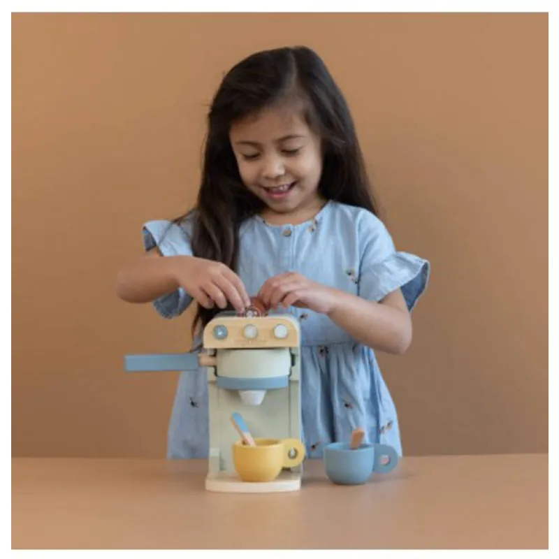 Деревянный игровой набор кофеварка, состоящий из 10 частей: кофеварка, 2 кружки, 2 ложки и 5 кофейных капсул. Игровой набор Little Dutch изготовлен из FSC-дерева.