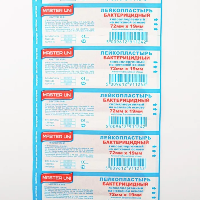 Лейкопластырь бактерицидный гипоаллергенный на нетканой основе 72мм х 19мм Антисептик хлорид бензалкония.