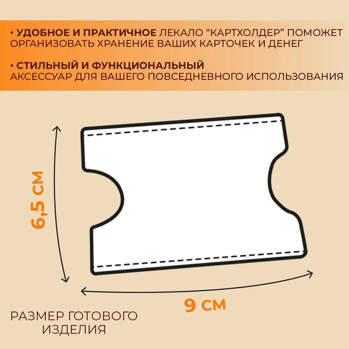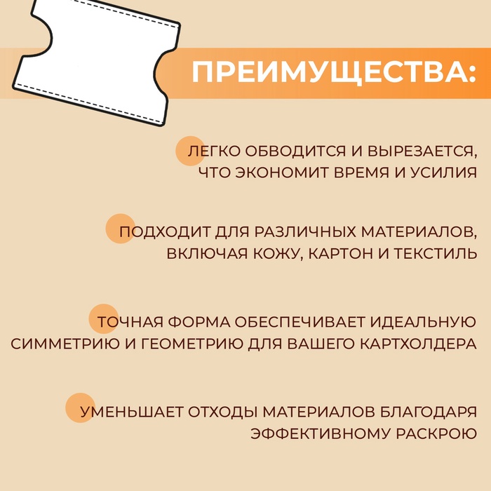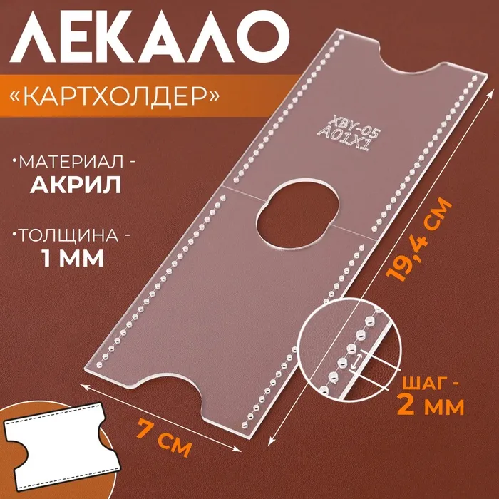 Лекало «Картхолдер» — это идеальный инструмент для тех, кто ценит точность и качество в рукоделии. С его помощью вы сможете создавать стильные и функциональные картхолдеры, которые станут отличным подарком или аксессуаром для личного использования. Воплотите свои творческие идеи в жизнь с этим надёжным и удобным лекалом!