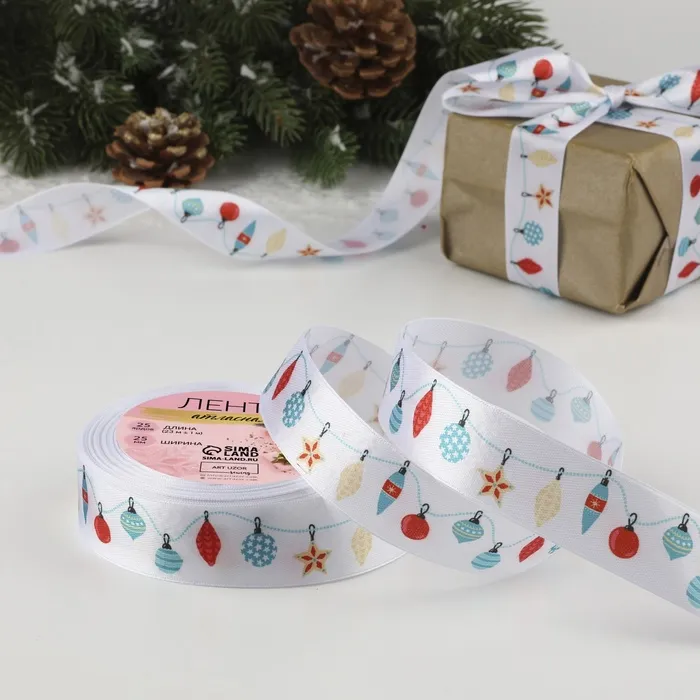 Новогодняя лента является универсальным помощником при изготовлении рукоделий, украшении интерьера, упаковке подарков и другого.