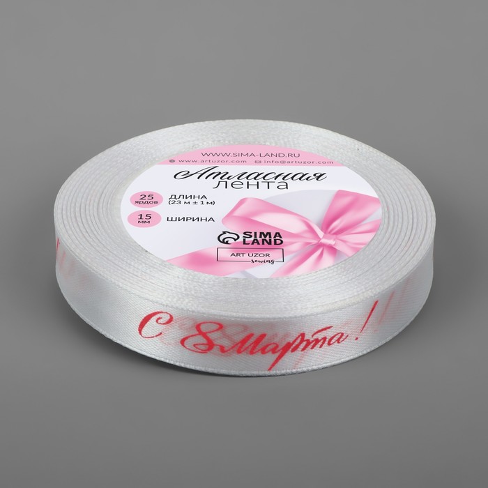 Лента атласная «С 8 Марта», 15 мм, 23±1 м, белая, розовая №001 — Характеристики