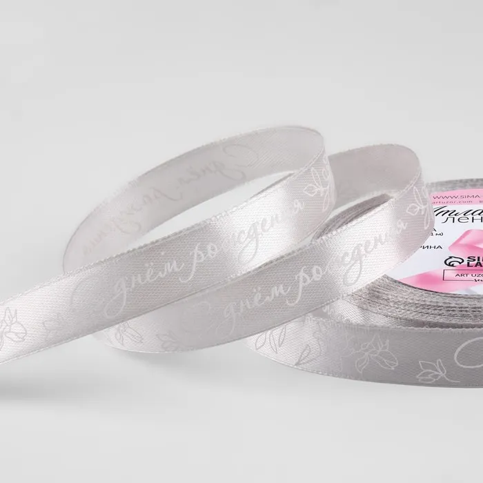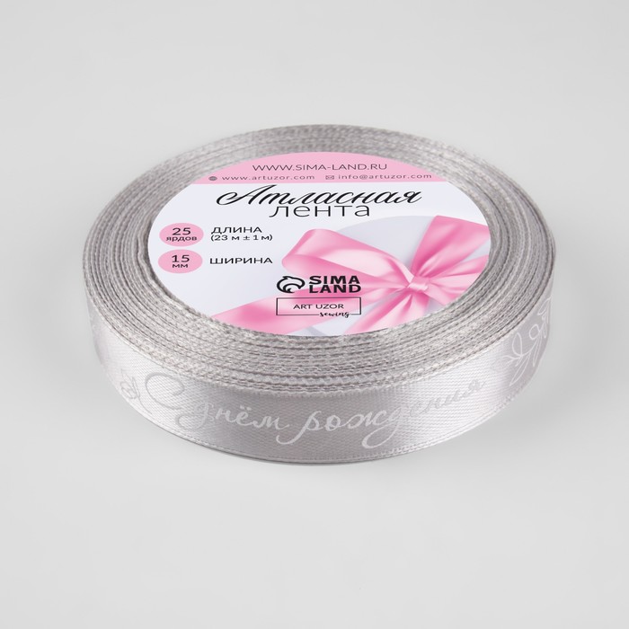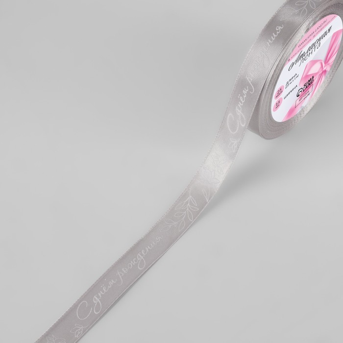 Лента атласная «С днём рождения», 15 мм, 23±1 м, серая №177 — Характеристики