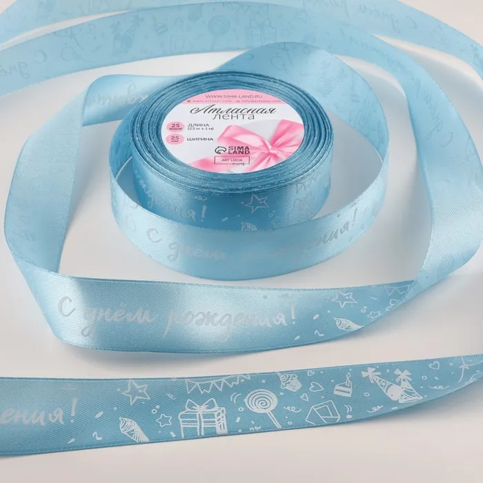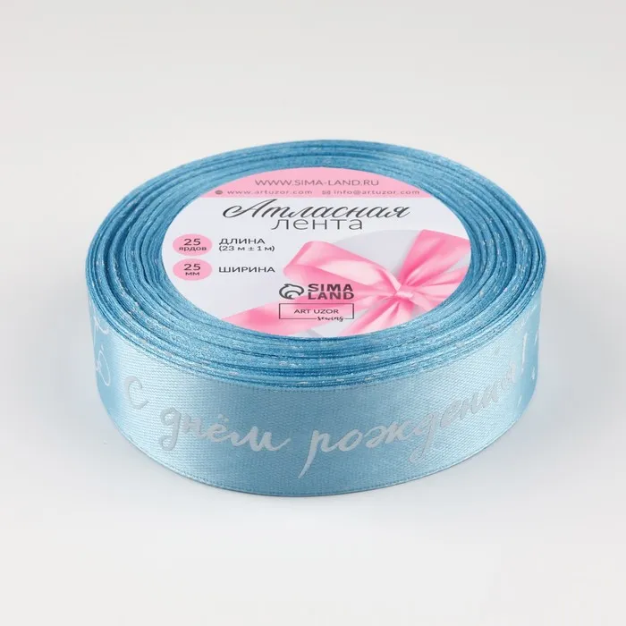 Лента атласная «С Днём Рождения», 25 мм, 23±1 м, голубой №187 — Характеристики