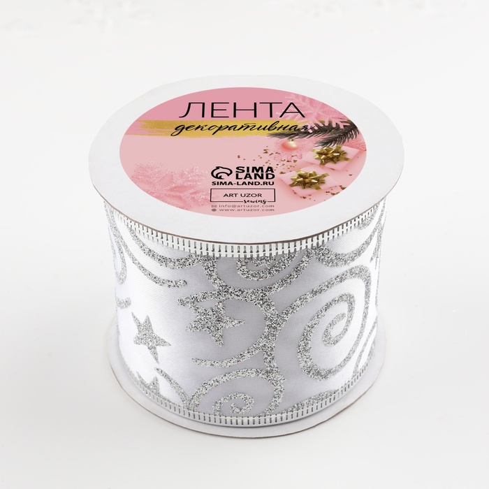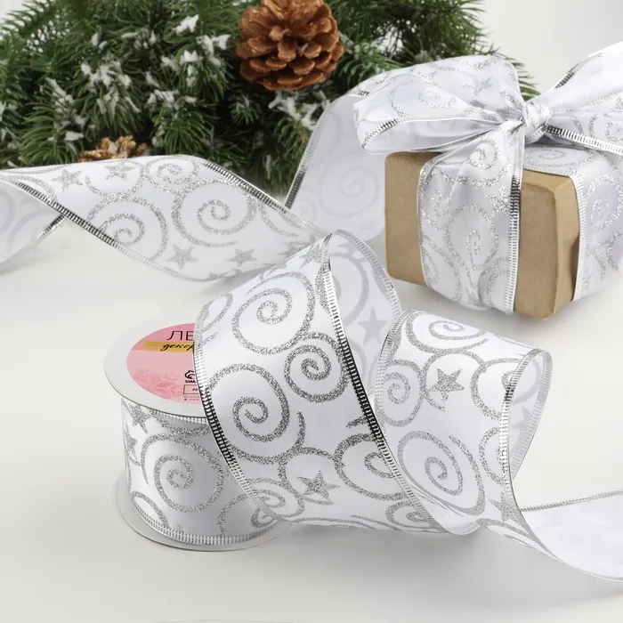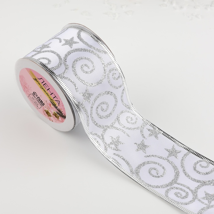 Атласная лента с металлической нитью и звёздами придаёт новогоднему декору мерцающий блеск и праздничный объём. Серебристый узор на белом фоне напоминает морозные узоры, создавая нарядный акцент в интерьере. Девяти метров хватит для оформления окон, создания бантов на шторы и упаковки особенных подарков.