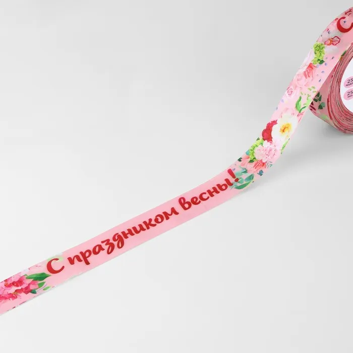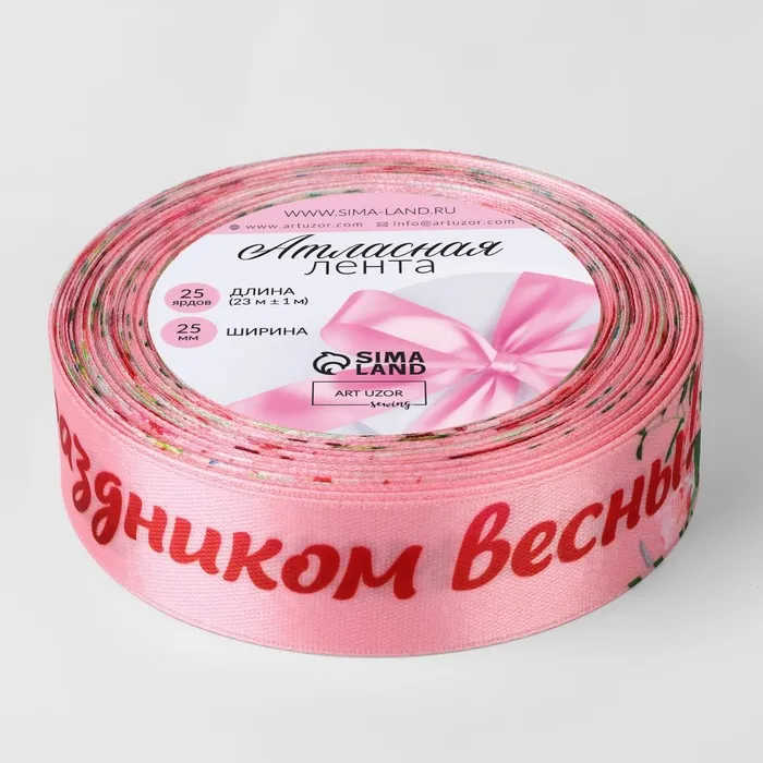 Лента атласная «С праздником весны!», 25 мм, 23±1 м, розовый — Характеристики