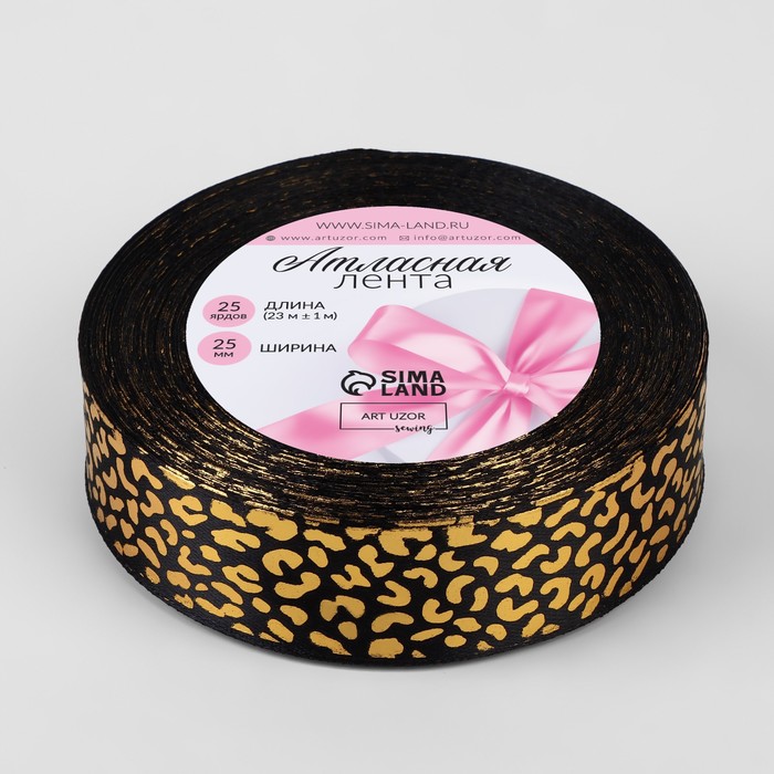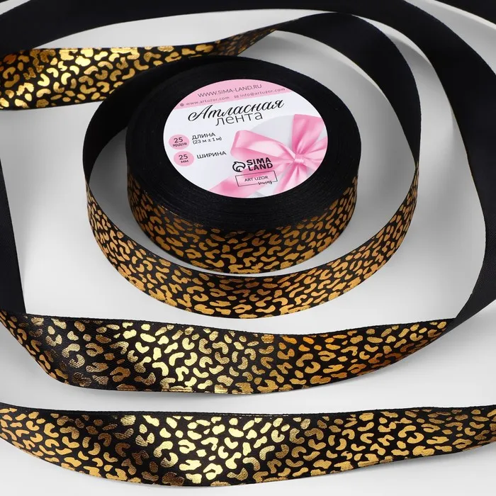 Лента атласная с тиснением «Леопард», 25 мм, 23 ± 1 м, цвет чёрный/золотой — Характеристики