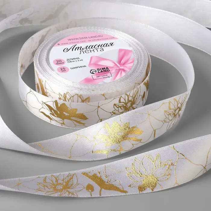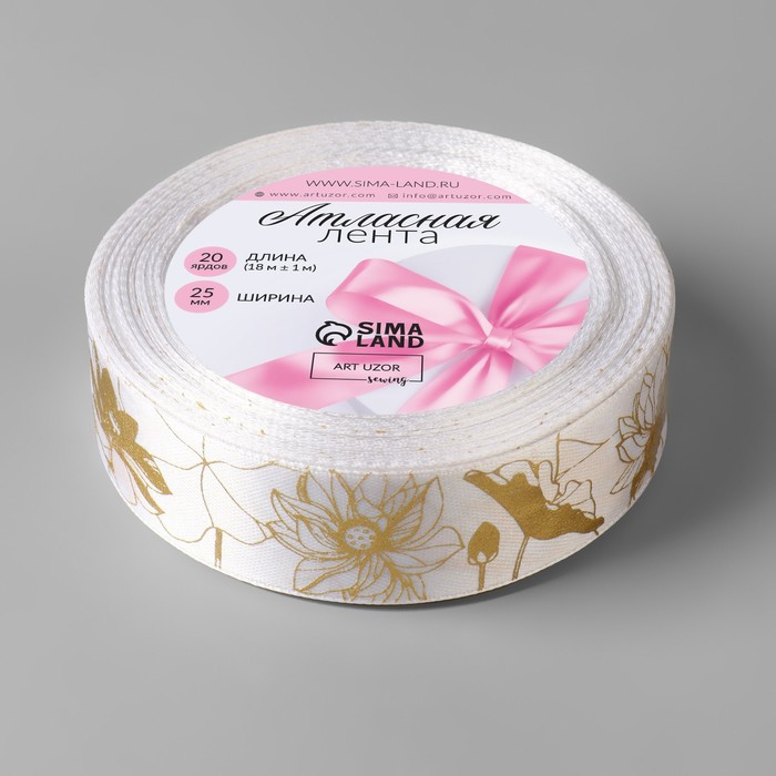 Лента атласная с тиснением «Лотос», 25 мм, 18±1 м, белая, золотая №001 — Характеристики