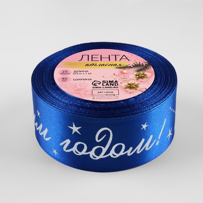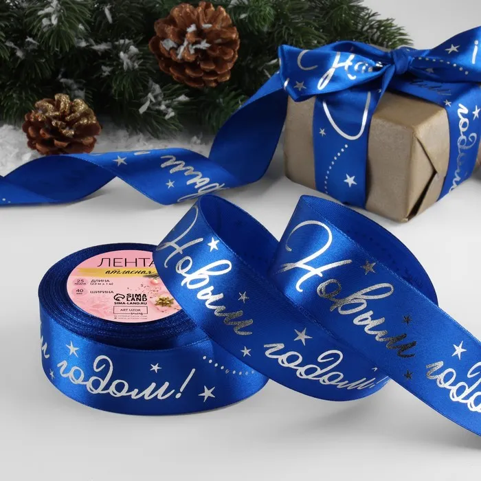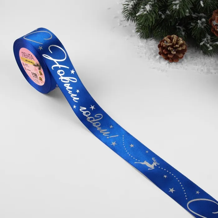 Лента атласная с тиснением «С Новым годом!», 40 мм, 23±1 м, синяя, серебряная №122 — Характеристики