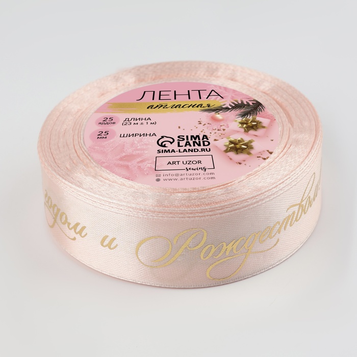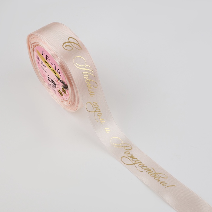 Лента атласная с тиснением «С Новым годом и Рождеством», 25 мм, 23±1 м, персиковая — Характеристики