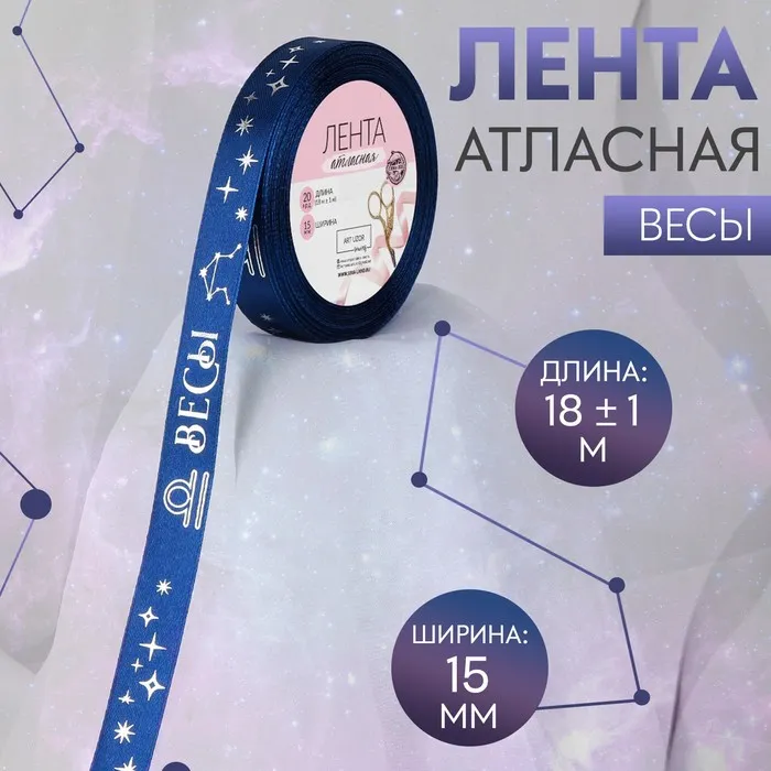 Лента атласная с тиснением «Весы», 15 мм, 18±1 м, тёмно-синяя №120 — Характеристики