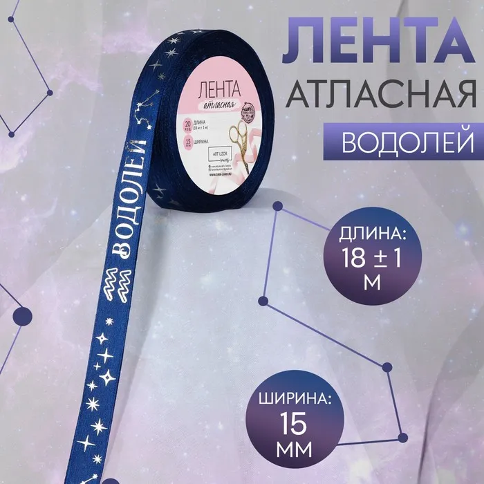 Лента атласная с тиснением «Водолей», 15 мм, 18±1 м, тёмно-синяя №120 — Характеристики