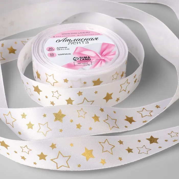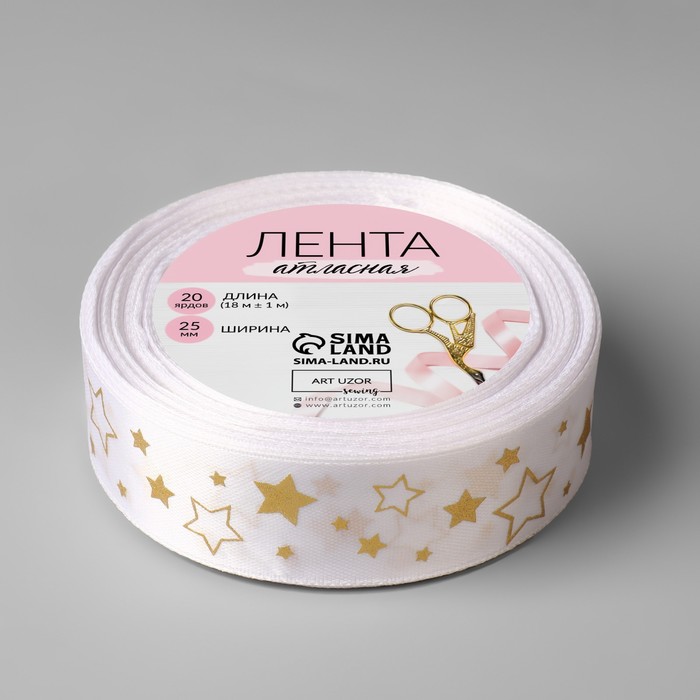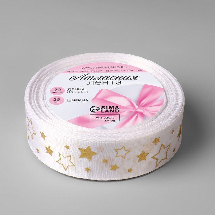 Лента атласная с тиснением «Звёзды», 25 мм, 18±1 м, белая, золотая №001