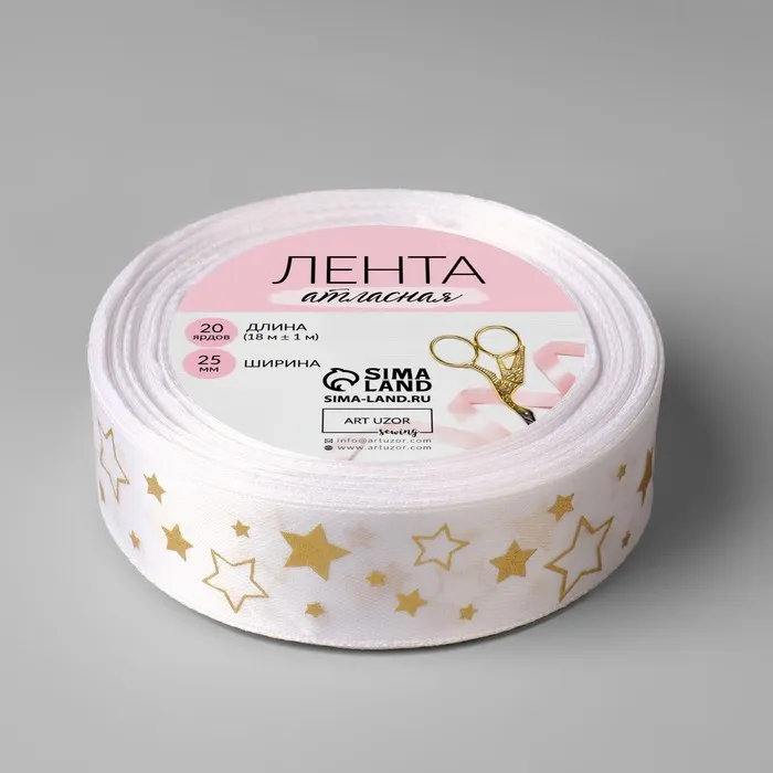 Лента атласная с тиснением «Звёзды», 25 мм, 18±1 м, белая, золотая №001 — Характеристики