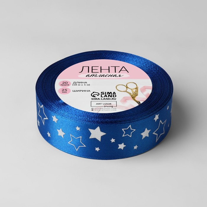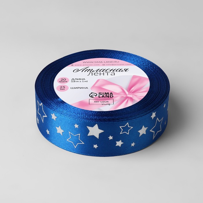 Лента атласная с тиснением «Звёзды», 25 мм, 18±1 м, синяя, серебряная №122 — Характеристики