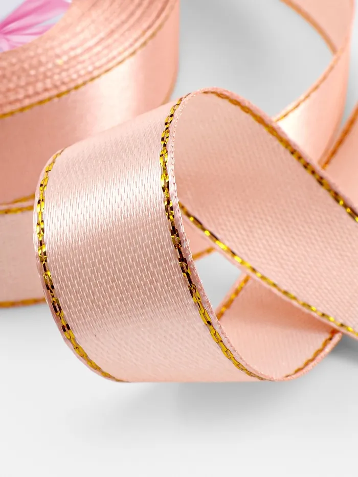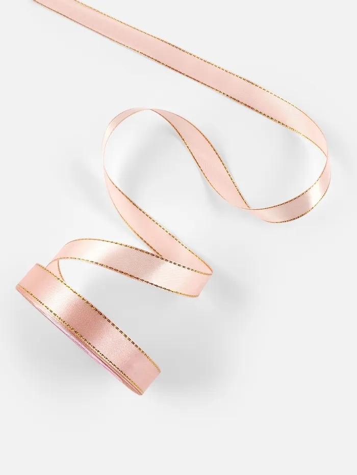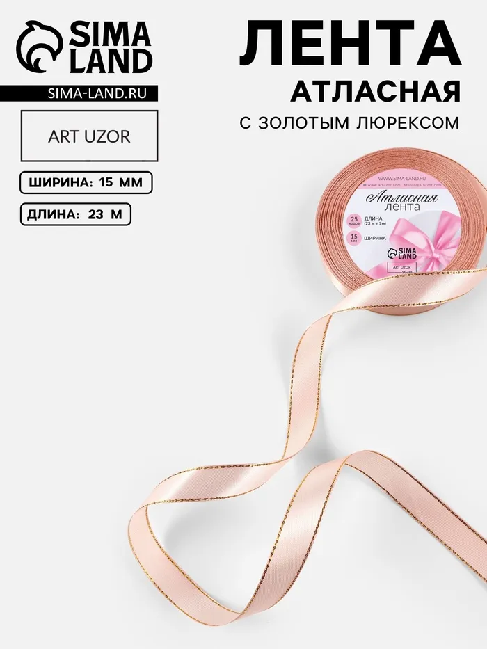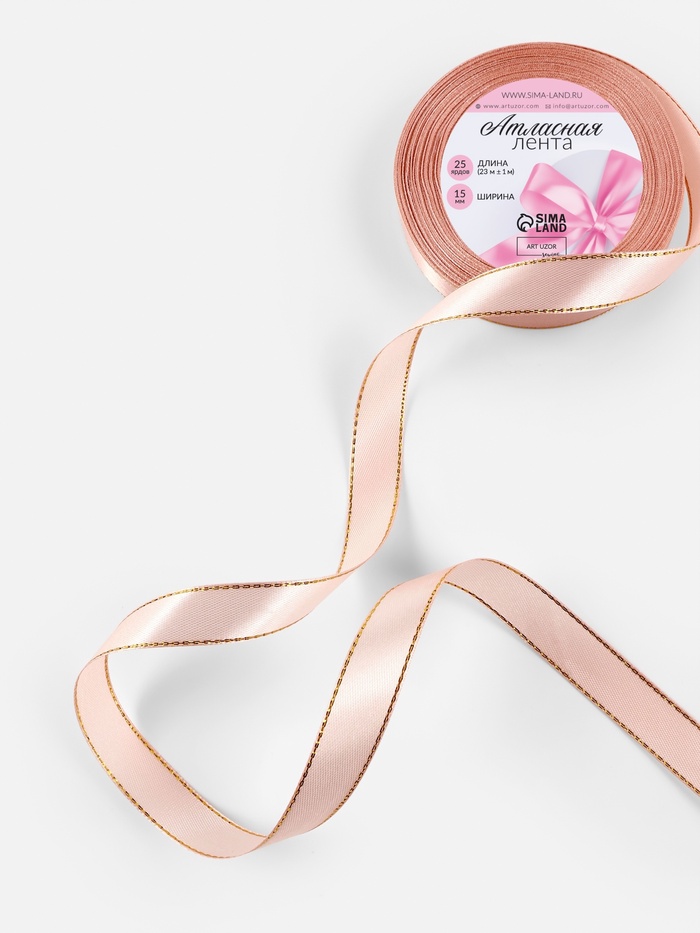 Лента атласная, с золотым люрексом, 15 мм, 23±1 м, светло-розовая №107 — Характеристики