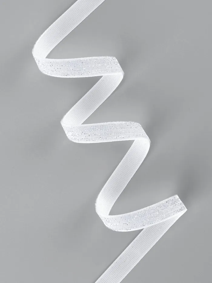 Эта бархатная лента с серебряным люрексом придаёт праздничным проектам деликатное мерцание. Сочетание матовой текстуры и серебристых нитей создаёт переливающийся эффект, подходящий для нарядного оформления.