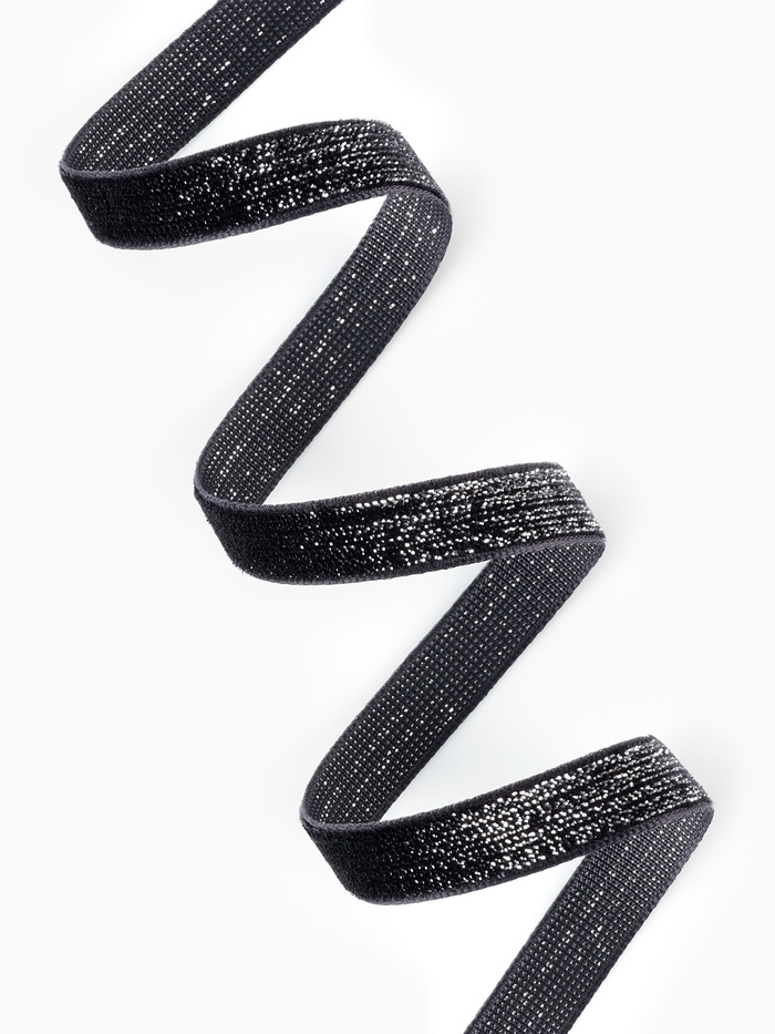 Черная бархатная лента с серебряным люрексом создает выразительный акцент для декора и творчества. Сочетание глубокого матового бархата и мерцающей нити придает проектам сдержанную элегантность.