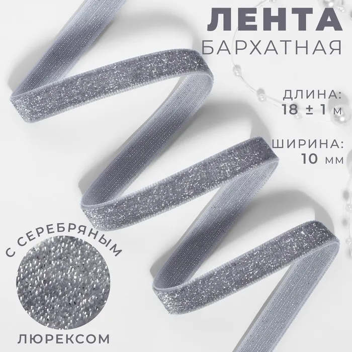Лента бархатная, с серебряным люрексом, 10 мм, 18±1 м, серая №184 — Характеристики