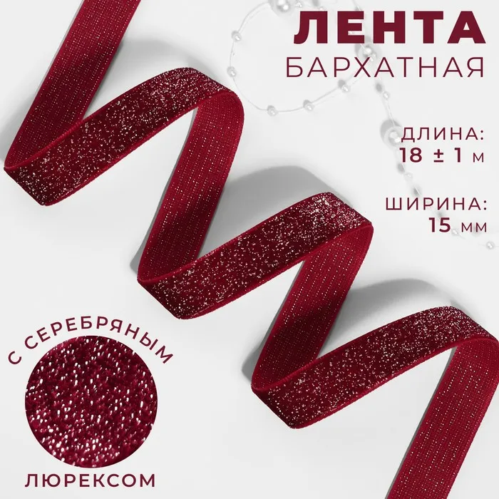 Лента бархатная, с серебряным люрексом, 15 мм, 18±1 м, бордовая №46 — Характеристики