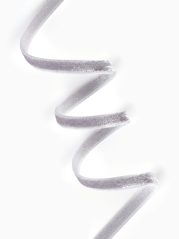 Узкая бархатная лента с серебром — тонкая нить элегантности для точечных акцентов. Серый фон и мерцающий люрекс создают сдержанный, но выразительный контраст, идеальный для минималистичных проектов, где важна каждая деталь. При ширине всего 6 мм и длине 18 метров она легко впишется даже в самые деликатные композиции — не перегружая, а подчёркивая.