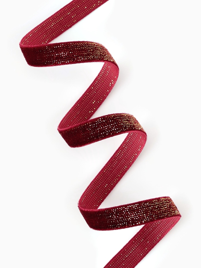 Эта бархатная лента с золотым люрексом придаёт праздничным проектам насыщенное мерцание. Сочетание глубокого бордового бархата и золотых нитей создаёт переливающуюся поверхность для выразительного декора.