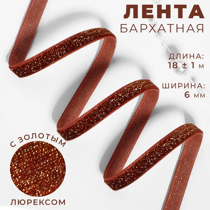 Лента бархатная, с золотым люрексом, 6 мм, 18±1 м, коричневая №119 — Характеристики