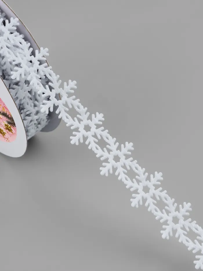Белая лента с ажурным узором снежинок создает нежное зимнее настроение в новогоднем декоре. Её фигурный край с праздничным орнаментом превращает упаковку подарков и украшение интерьера в творческий процесс.