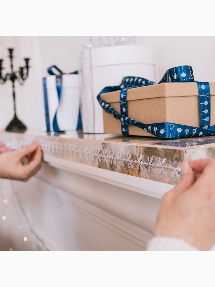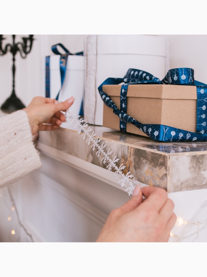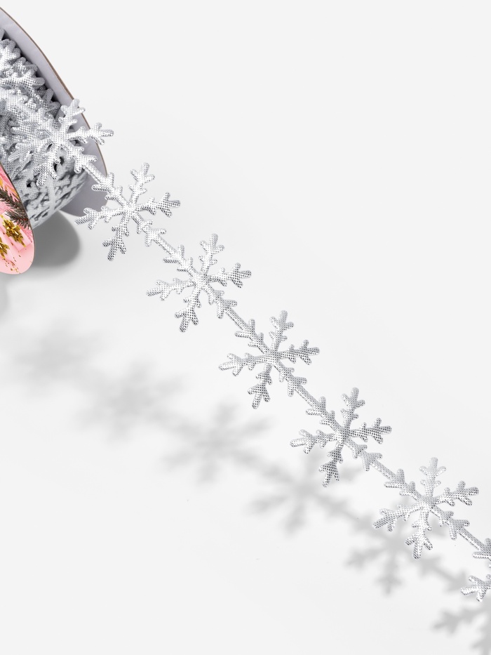 Серебристая лента со снежинками создаёт цельный образ зимнего оформления. Благодаря плотной текстуре изделие сохраняет форму, поэтому украшения выглядят аккуратно и устойчиво при многократном использовании.