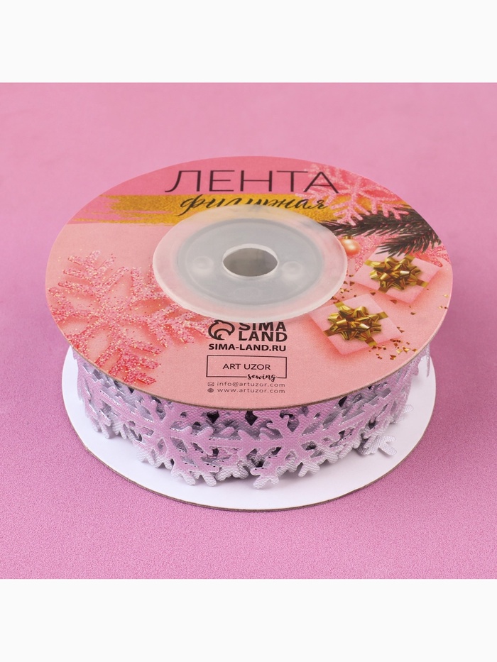 Фигурная лента «Снежинки» станет выразительным элементом зимнего декора. Её серебристый оттенок напоминает свежий иней на стекле и подчёркивает атмосферу зимнего праздника. Такой аксессуар используют для упаковки подарков, украшения ёлок и создания интерьерных композиций. Снежинки на ленте добавляют лёгкости и прозрачности, словно морозный узор на окне.