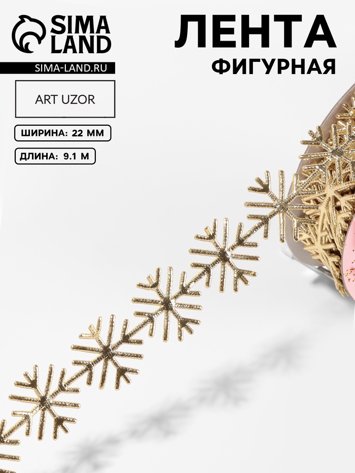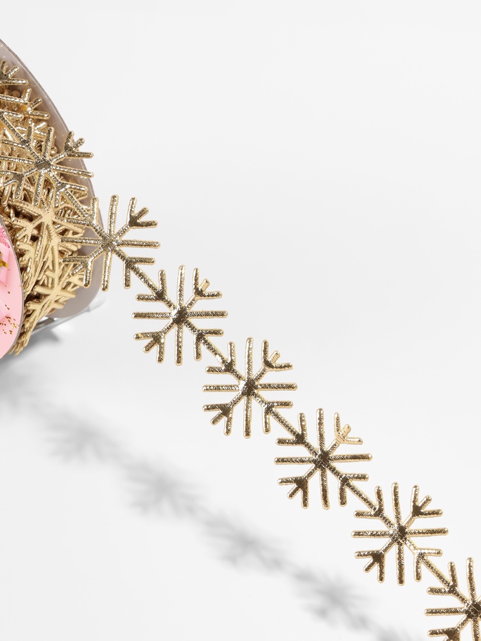 Эта фигурная декоративная лента с золотистым оттенком и зимней тематикой станет отличным дополнением для праздничных украшений, открыток и подарочной упаковки. Ее ширина 22 мм и длина 9,1 метра позволяют создавать яркие и аккуратные декоративные элементы для новогодних интерьеров, зимних мероприятий или тематических композиций. Материалы — бумага и полиэстер — обеспечивают прочность и приятную текстуру, а фигурный дизайн с изображением снежинок добавляет праздничной атмосферы.