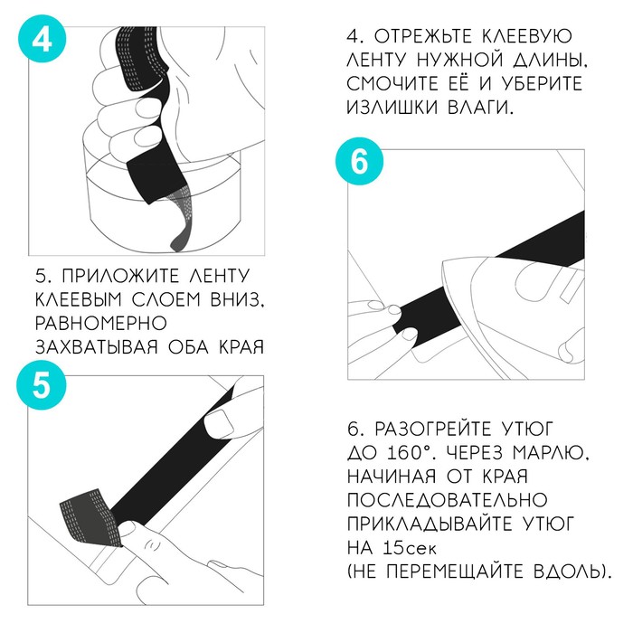 Клеевые стежки нанесены на одной стороне по двум краям ленты. Перед работой намочите ленту водой. Расположите ленту клеевым слоем на край подгибки изнаночной поверхности ткани и прогладьте утюгом. Температура воздействия должна быть достаточно высокой. Чтобы защитить ткань от высокой температуры, накройте её бумагой или марлей. В случае, если лента не зафиксировалась на ткани, сбрызните её водой и повторите проглаживание.