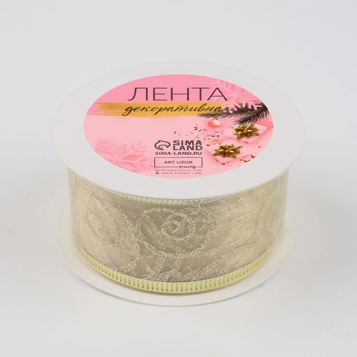 Лента подойдёт для упаковки подарков в праздничном стиле, украшения ёлки, гирлянд и венков. Она используется в флористике для акцентирования композиций и в интерьере — для декорирования камина или праздничного стола. Золотистый оттенок гармонирует с зелёными еловыми ветвями, красными акцентами и светлыми элементами декора.
