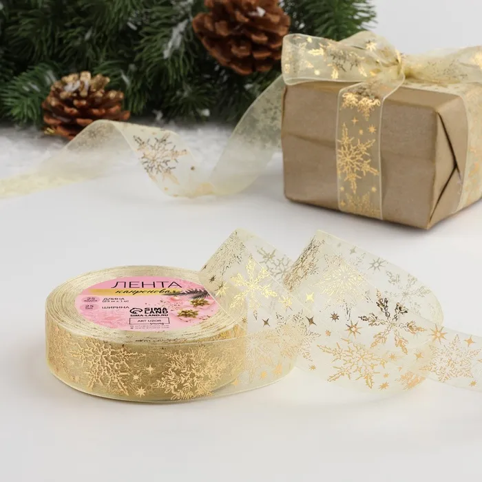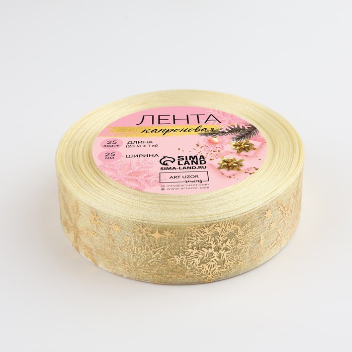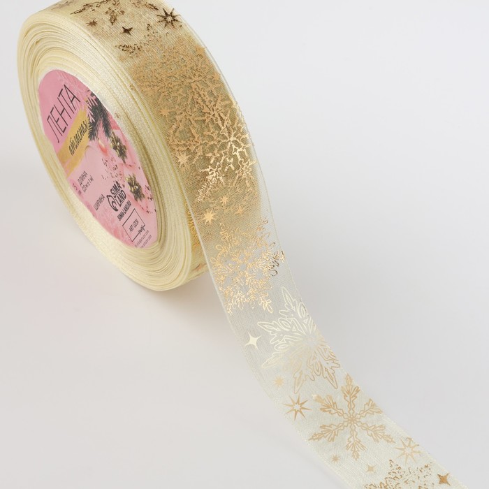 Лента капроновая с тиснением «Фигурные снежинки», 25 мм × 23 ± 1 м, цвет бежевый/золотой — Характеристики