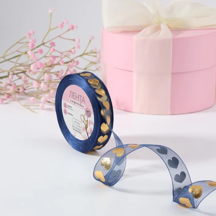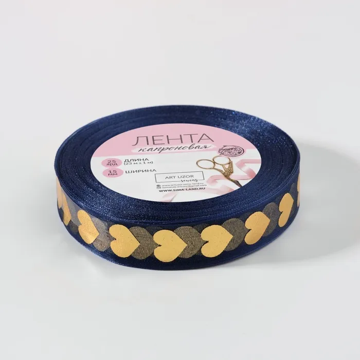 Лента капроновая с тиснением «Сердца», 15 мм, 23±1 м, тёмно-синяя, золотая — Характеристики