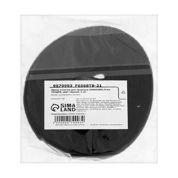 Лента-липучка для проводов 5000×20×1.5 мм ТУНДРА, чёрная, 1 шт.