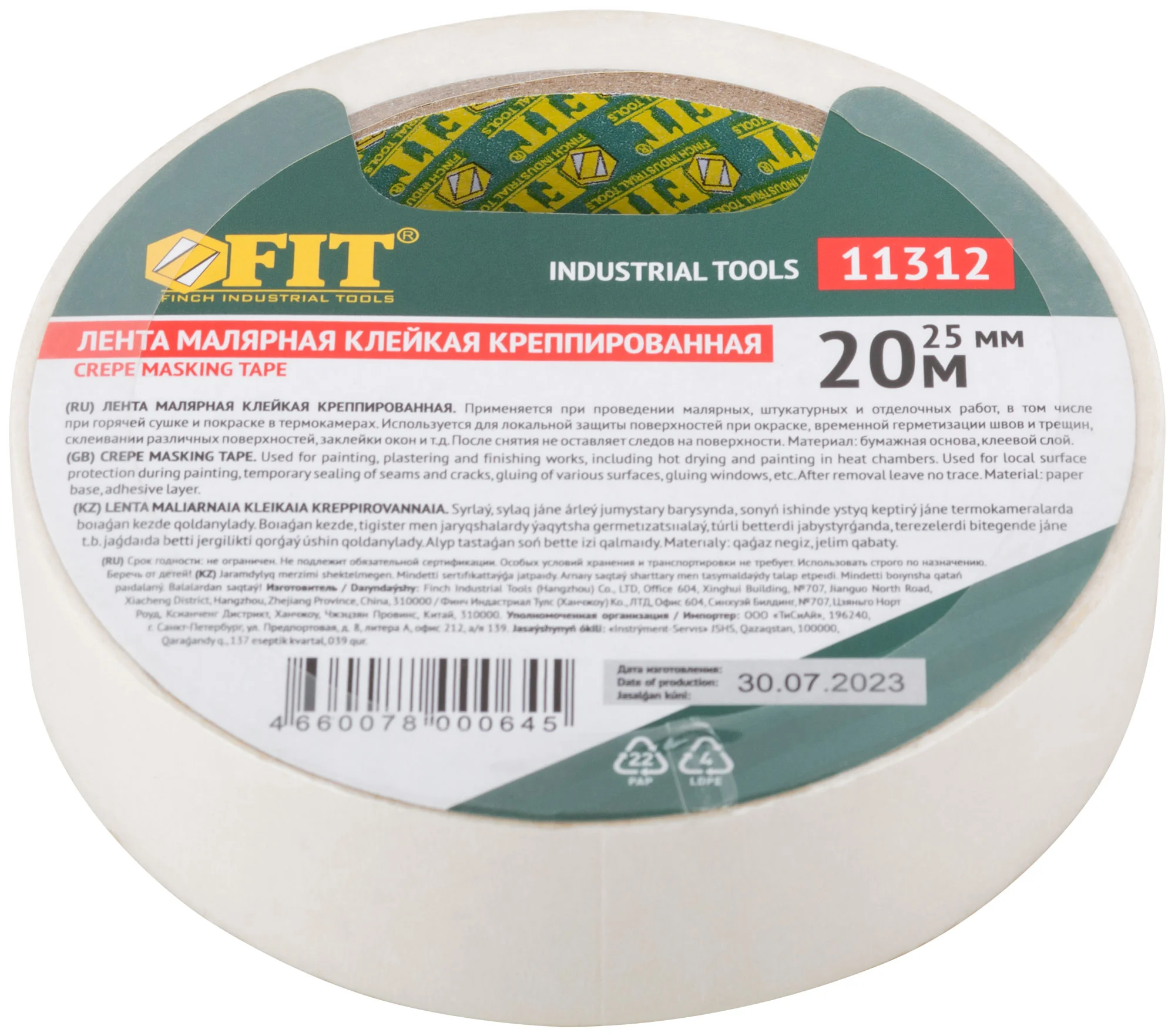 Лента от бренда FIT имеет ширину 25 мм и длину 20 м, что делает её удобной для использования в различных малярных и строительных процессах. Креппированная текстура обеспечивает надежную адгезию к поверхностям.