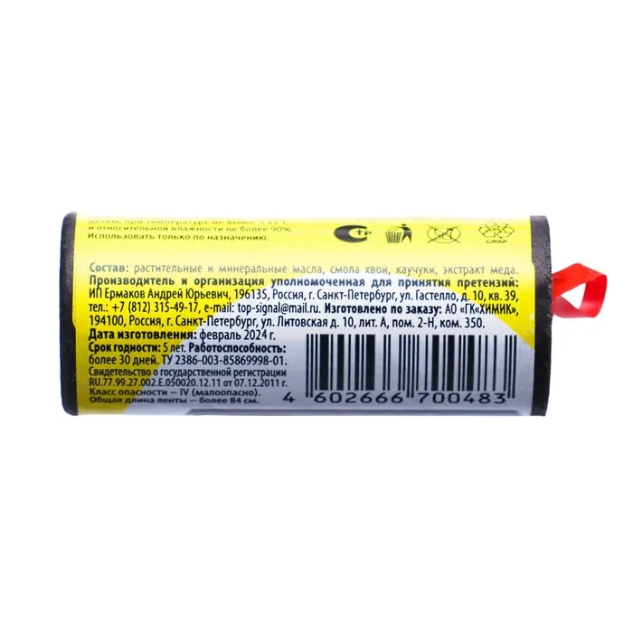 ОписаниеДэта супер липкая лента от мух 4 штПредназначена для борьбы с надоедливыми мухами и другими летающими насекомыми. Без запаха, не токсична. Для дома, дачи и пикника. Рекомендовано использовать 2–3 штуки на каждые 10 м² площади. Средство длительного действия. Замена требуется только по мере заполнения ленты насекомыми. Состав: растительные и минеральные масла, смола хвои, каучуки, экстракт меда