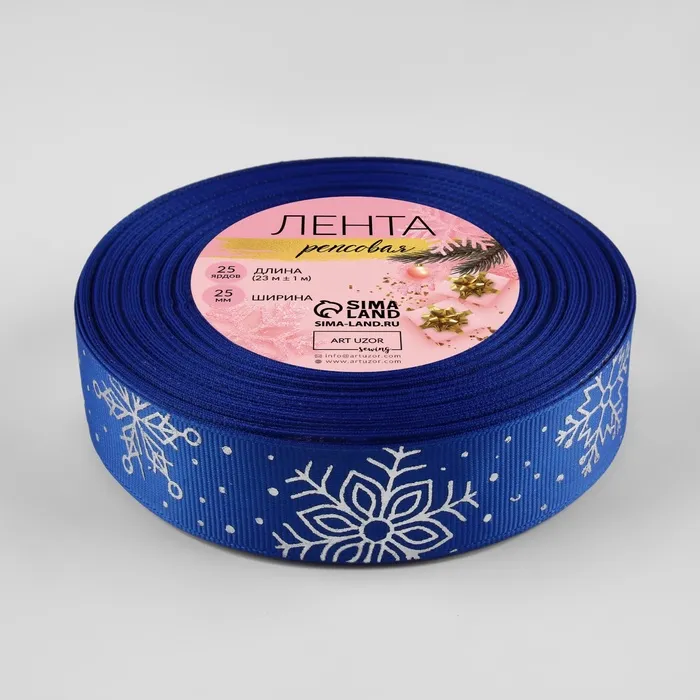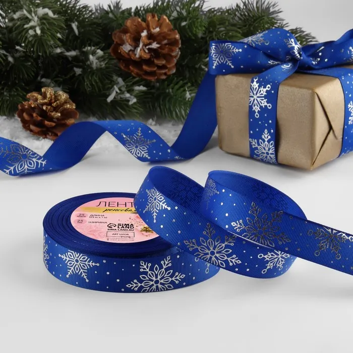 Лента репсовая с тиснением «Фигурные снежинки», 25 мм, 23±1 м, синяя, серебрянная №040 — Характеристики
