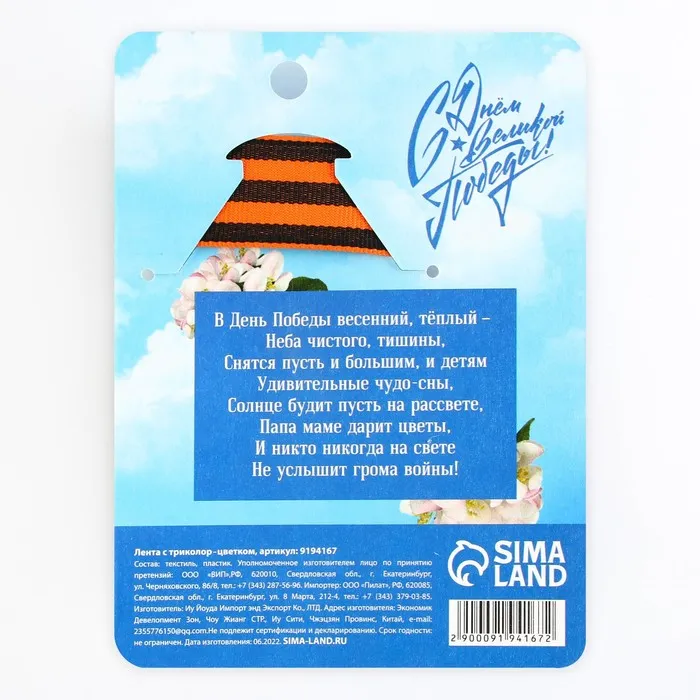 Лента с белым цветком на 9 мая выполнена из очень качественного, плотного материала. Все детали на Георгиевской ленте выполнены аккуратно, смотрятся потрясающе. В период Великой Отечественной войны полоски на ленте воспринимали как цвета пороха и огня. Но во все времена этот символ ассоциировался с мужеством, героизмом и победой. Каждый год 9 мая мы крепим Георгиевские ленточки, чтобы проявить уважение к воинам и показать, что память об их подвиге жива. Носите Георгиевскую ленту всей семьей на праздничные шествия и мероприятия в честь 9 Мая.