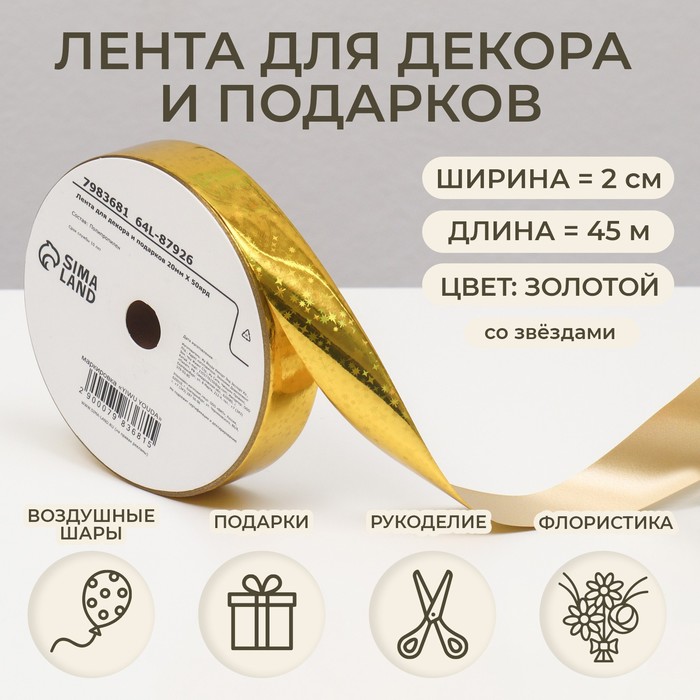 Декоративная подарочная лента отлично подходит для упаковки подарков, оформления букетов, рукоделия. Уникальный дизайн подчеркнет индивидуальность подарка. А прочный, эластичный материал делает ленту универсальной для любой деятельности.