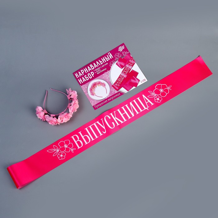 Карнавальный набор «Прекрасная выпускница» — эффектное дополнение к выпускному костюму для школьницы или студентки. Лента прекрасно подчеркнёт образ, а ободок с цветами добавит игривости.