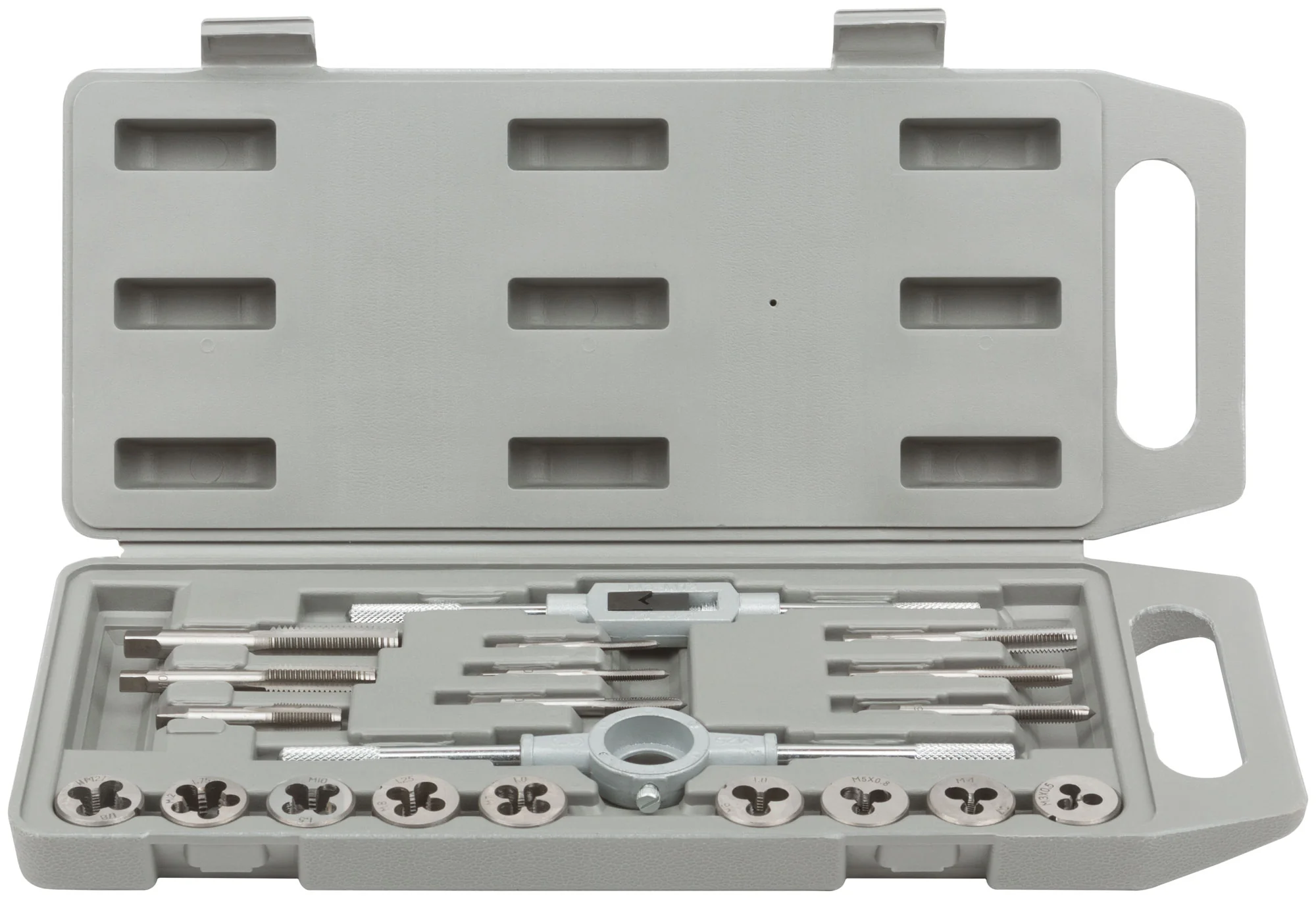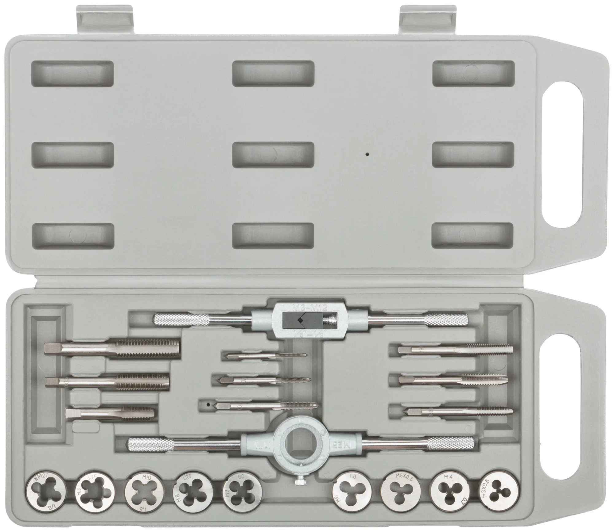 Лерки и метчики изготовлены из легированной инструментальной стали, что обеспечивает их долговечность и точность. В набор входит 9 метчиков и 9 плашек разных размеров, а также метчикодержатель и плашкодержатель, что делает его универсальным инструментом для самых разных задач.