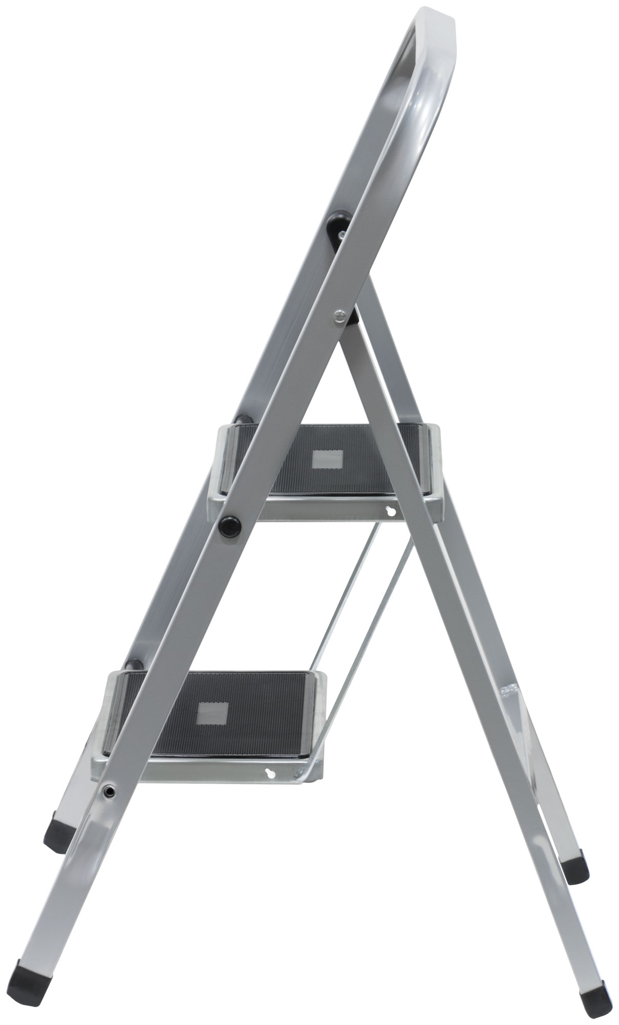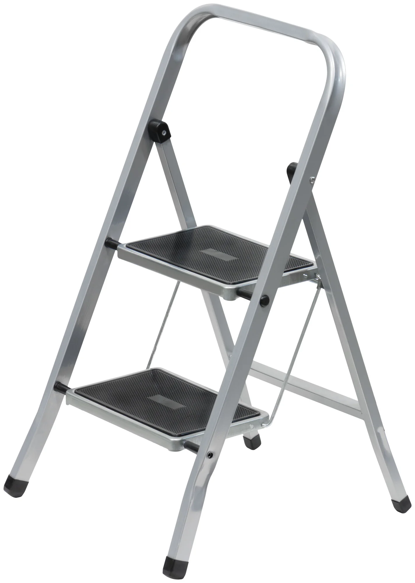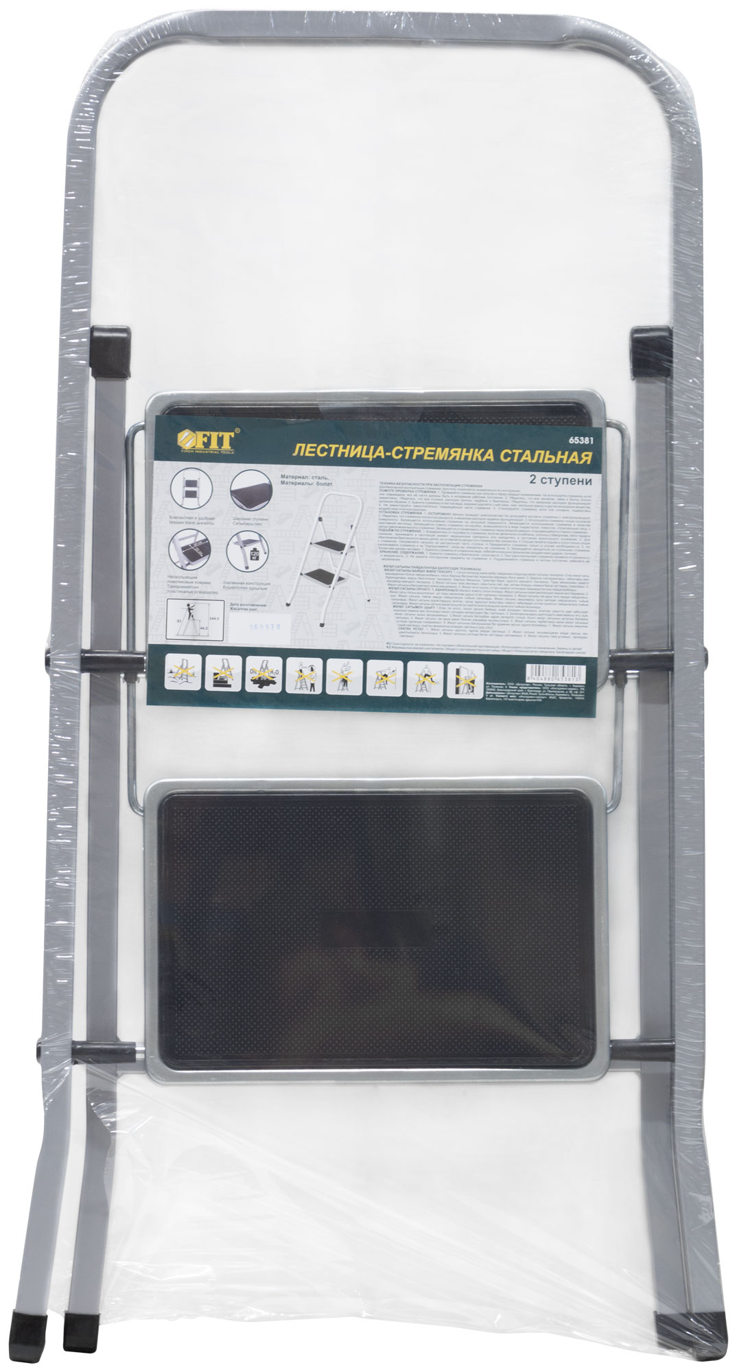 Лестница оснащена двумя широкими ступенями с пластиковыми ковриками для безопасного подъема. Стальная конструкция обеспечивает надежность и долговечность, а высота стремянки составляет 88 см, что позволяет комфортно работать на небольшой высоте.