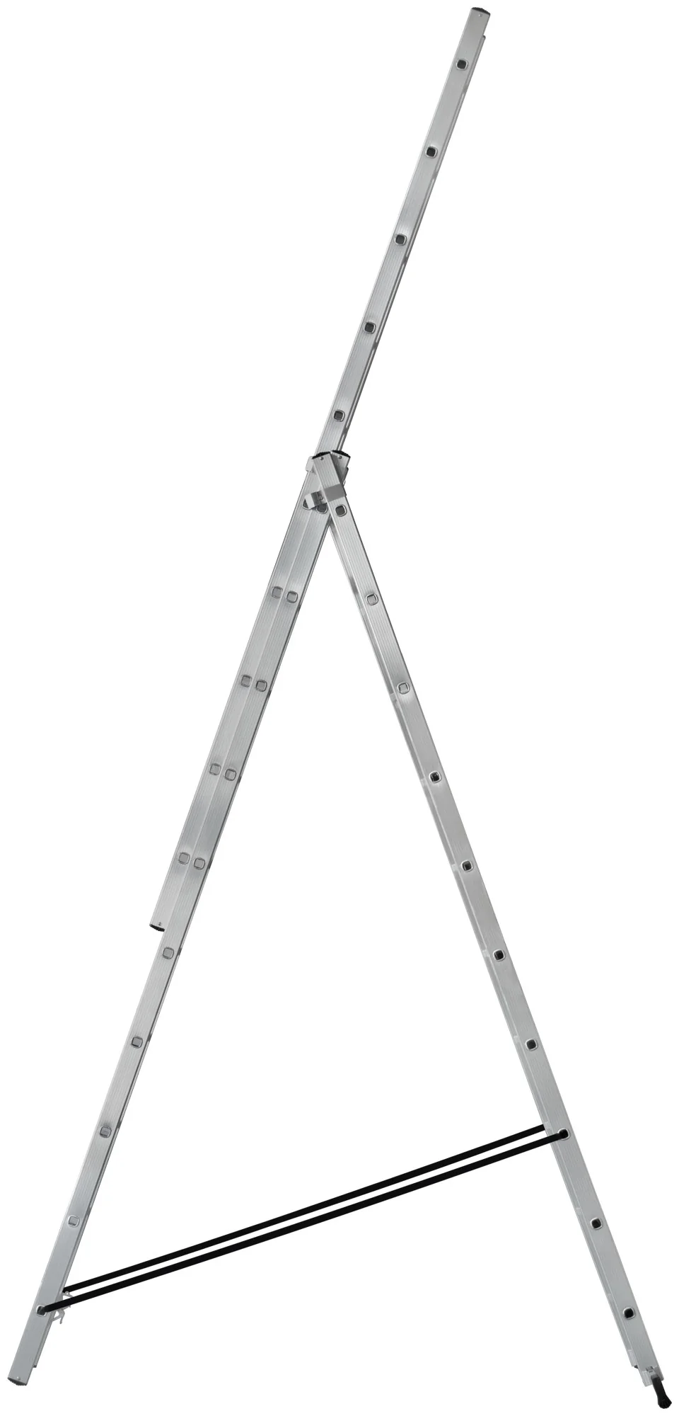 Лестница выполнена из прочного алюминия, что обеспечивает легкость и долговечность конструкции. Трехсекционная система позволяет использовать её в различных конфигурациях: как приставную, стремянку или полностью разложенную.