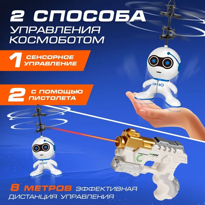 Летающая игрушка «Космобот с бластером» отправится с малышом в невероятное космическое приключение по межгалактическому пространству! Игрушка удивит любого ребёнка благодаря двум интересным способам управления: с помощью рук и бластера. Игрушка взлетает от соприкосновения с твёрдой поверхностью. Внутри неё установлен сенсор, он срабатывает при касании игрушки руки или пола.